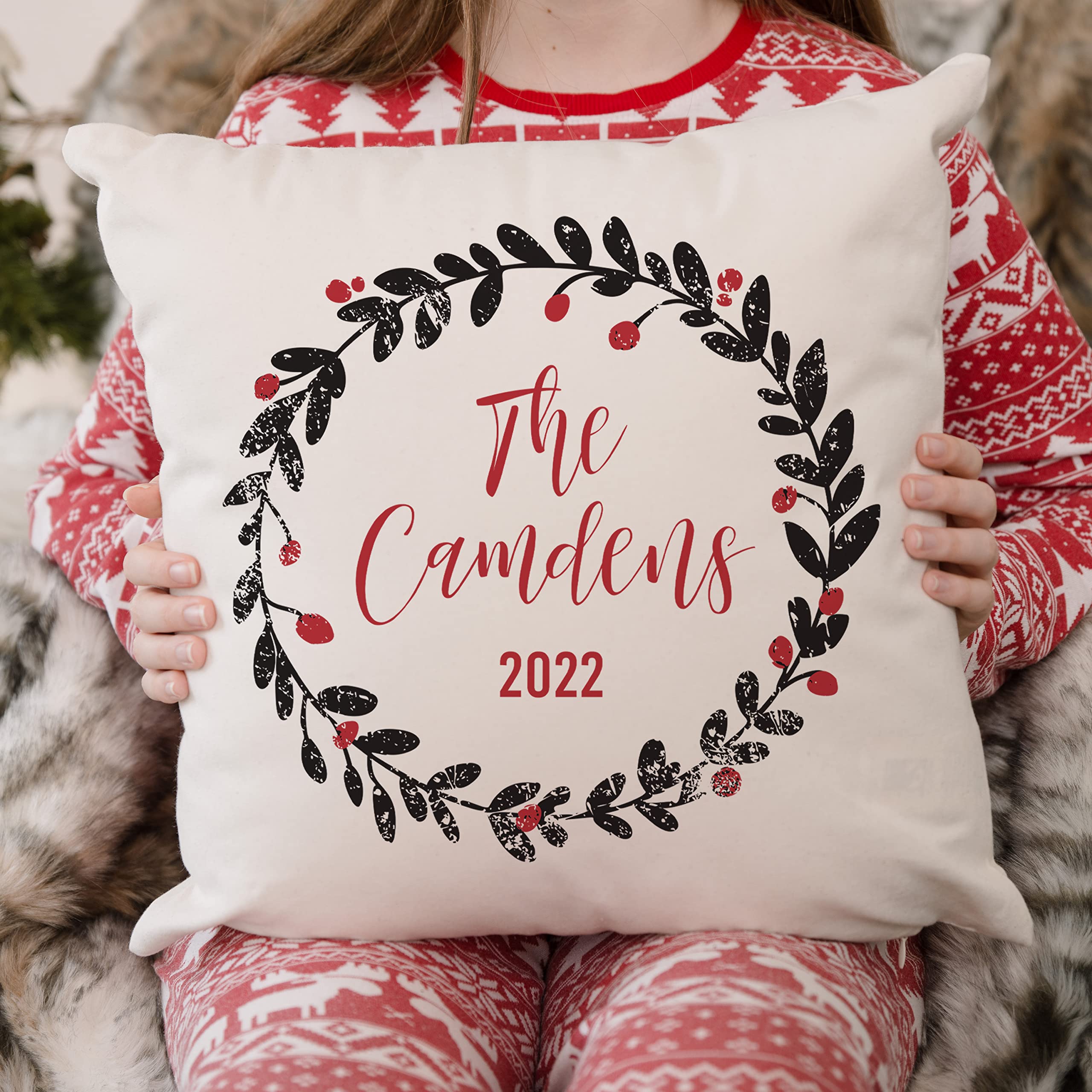 Qualtry Personalized Christmas Throw Pillow with Names 18x18, Decorative Winter Pillow Cover (Wreath Family Name Design) - Indoor Christmas ...